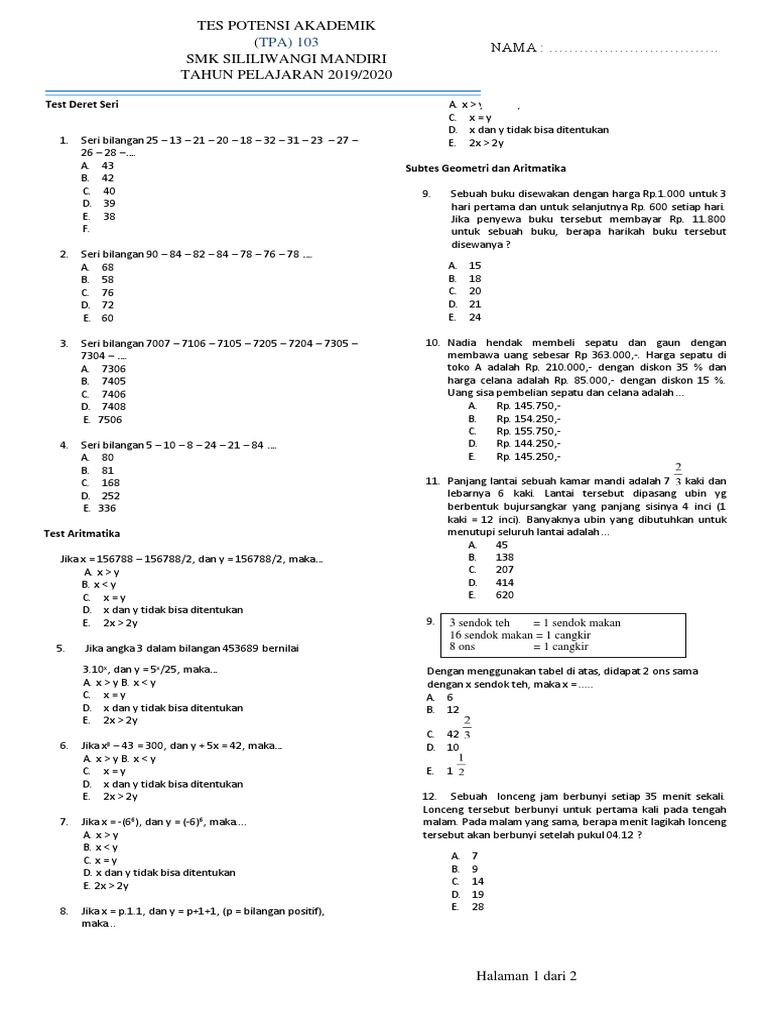 Get Soal Tes Masuk Smk Telkom Malang Pics Revisi Words ... from lh5.googleusercontent.com Latihan soal psikotes masuk sekolah favorit tahun 2013/2014 by : Dan soal ini juga bisa digunakan sebagai referensi untuk tes penjurusan. Bagaimana dengan persiapan menuju sekolah lanjutan? Soal latihan tes online masuk sma/smk negeri tahun pelajaran 2019/2020. Soal dan pendaftaran ujian masuk sma unggul del 2020. Silakan klik soal yang sering muncul pada tes masuk man, sma dan smk‼️ untuk melihat artikel selengkapnya. Soal latihan tes masuk sma smk dan tes penjurusan atau peminatan aina mulyana wednesday may 08 2019 berita. Contoh soal tes masuk smk jurusan jasa boga.