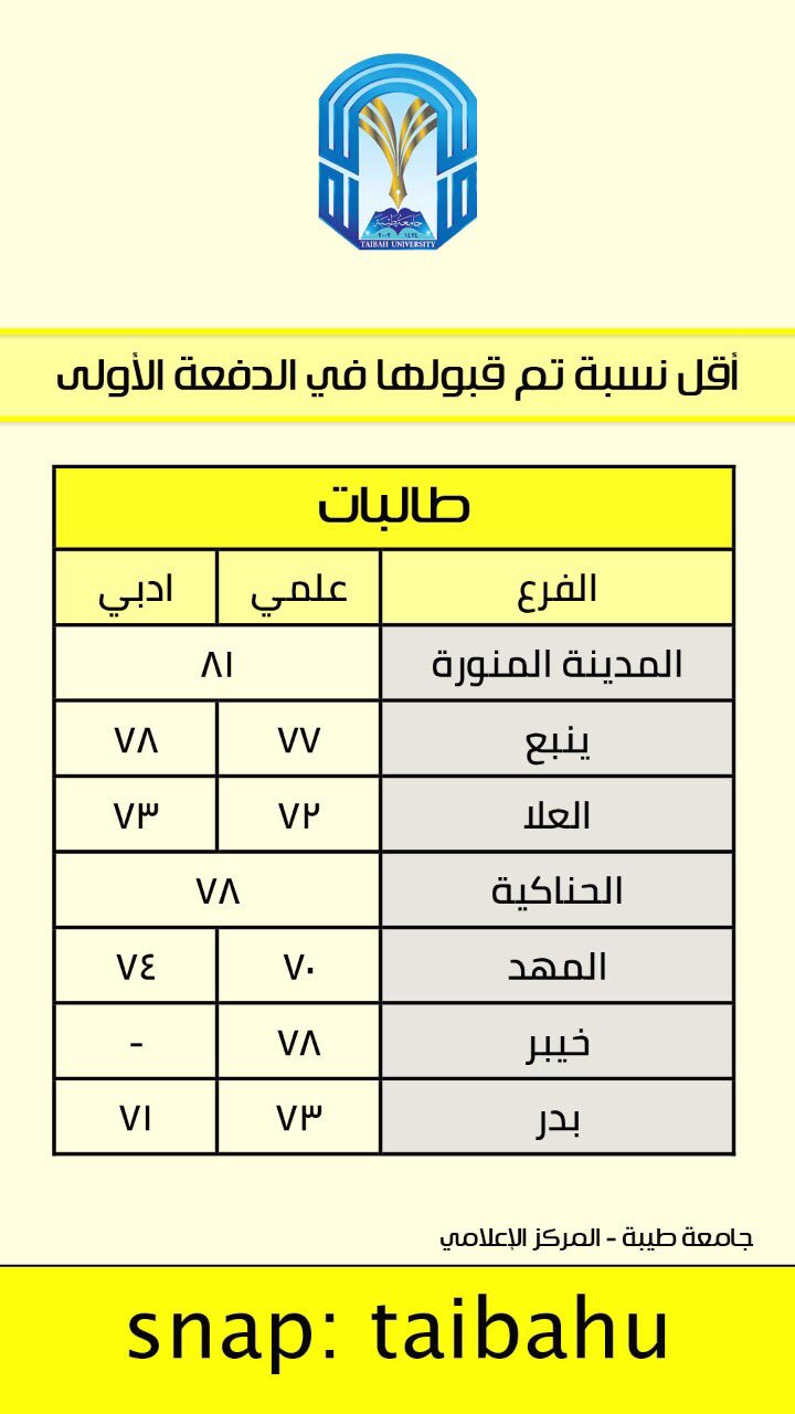 The latest tweets from @taibahu تعتبر جامعة طيبة بمثابة جامعة سعودية شاملة تهدف إلى نشر المعرفة وخدمة المجتمع، وبالإضافة إلى ذلك تهدف الجامعة إلى تحقيق التوجهات الإستراتيجية السبعة التالية:. النسبة الموزونة لجامعة طيبة 1442. البيانات غير صحيحة, رقم الطالب او كلمه المرور خطأ. جامعة طيبة العمادات عمادة القبول والتسجيل التقويم الجامعي التقويم الجامعي للعام 1438 1439 هـ.